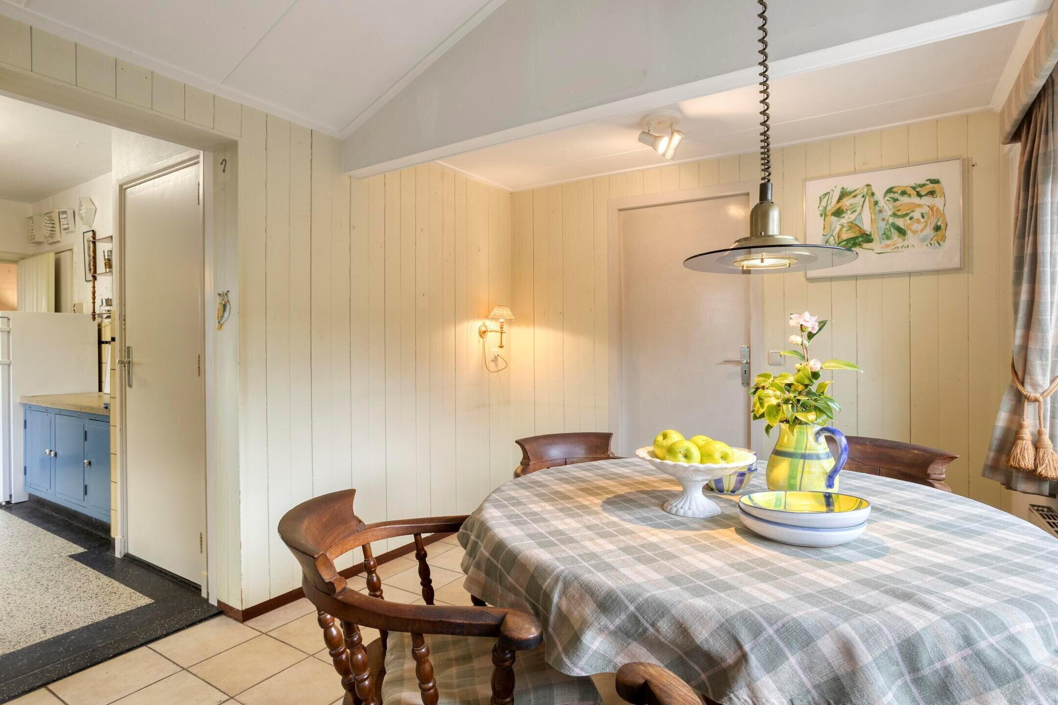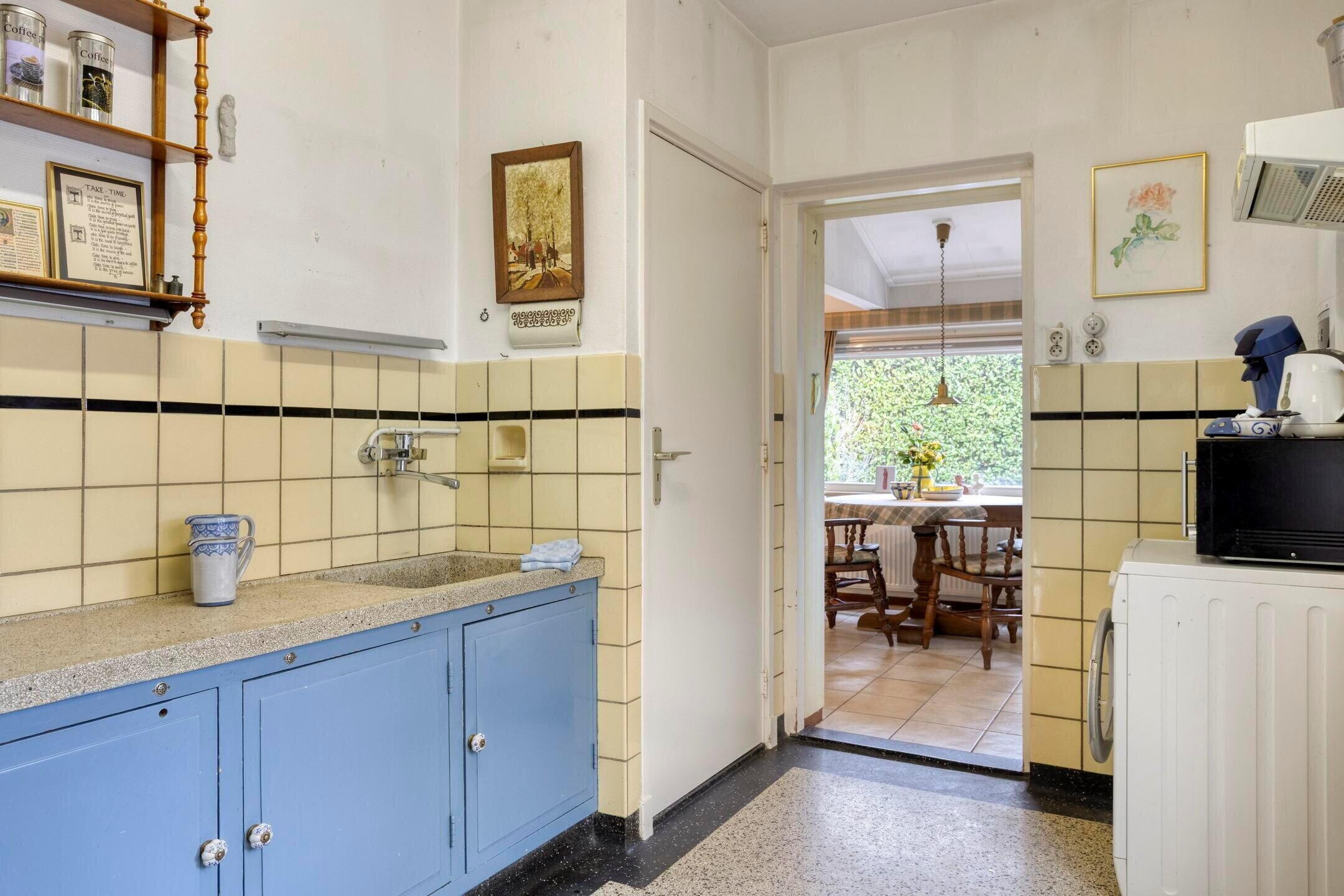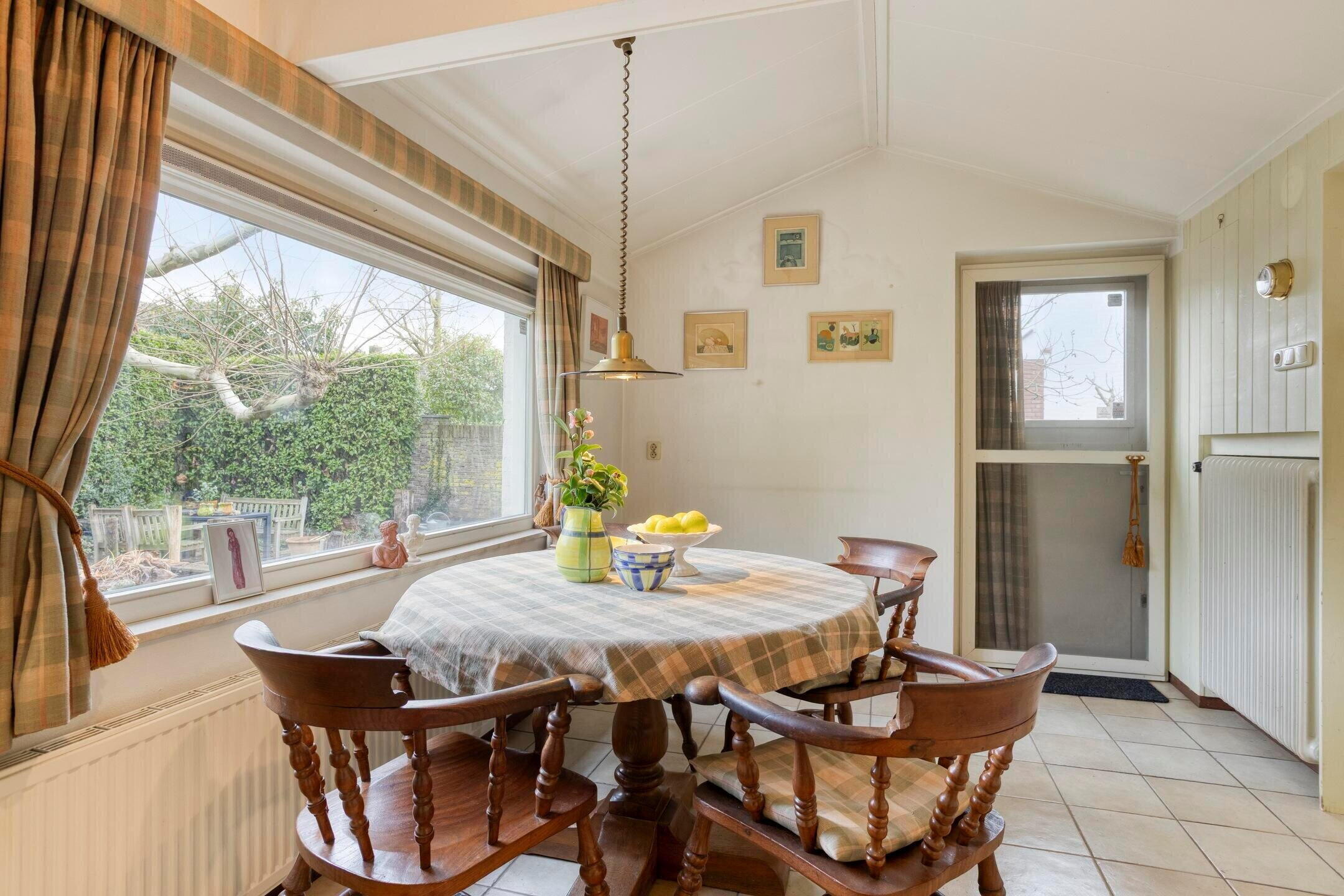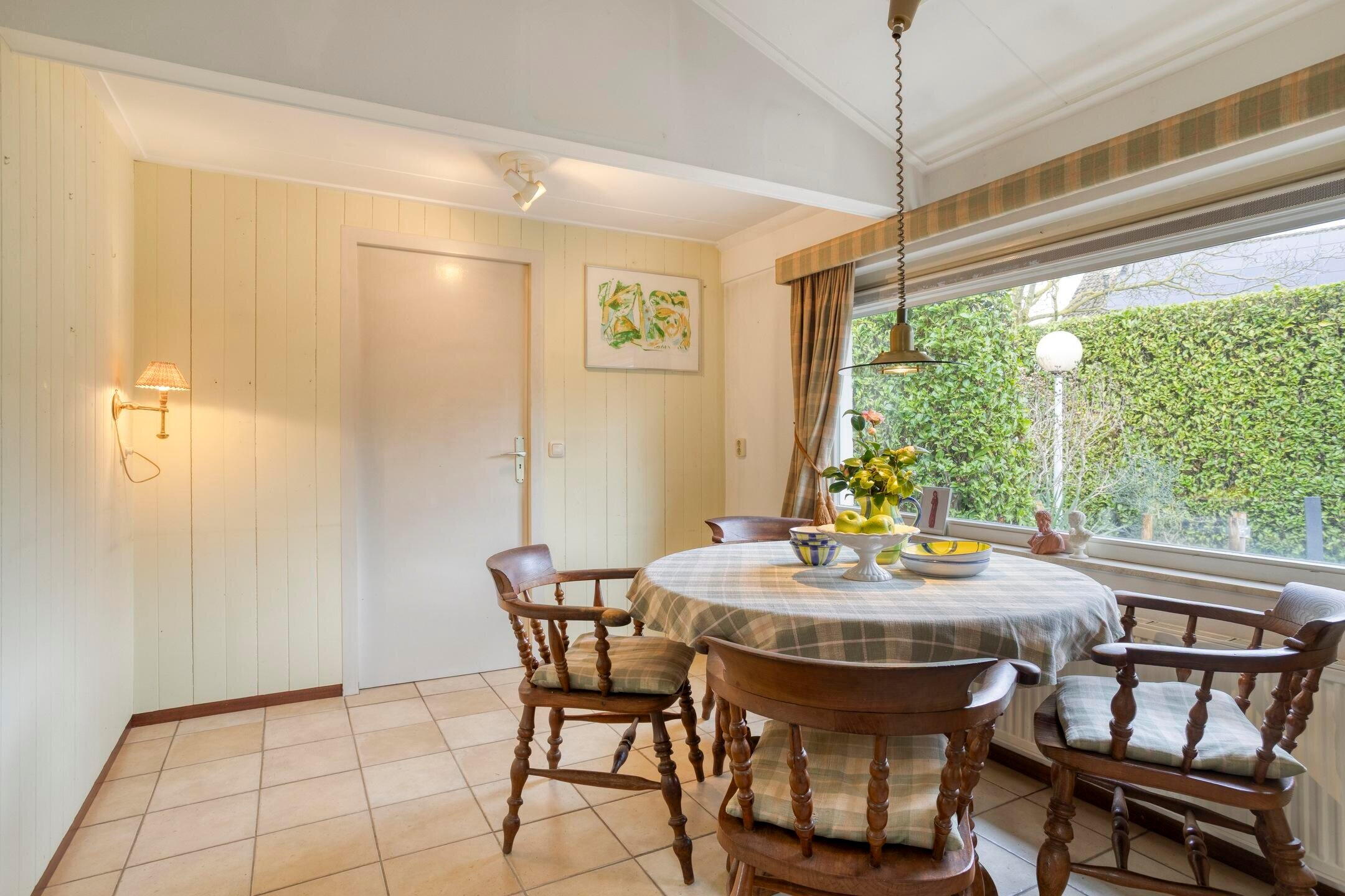 Grenzend aan de woonkamer ligt de gesloten keuken. Vanuit hier bereikt u de eetkamer, een aangename en lichte ruimte die zich uitstekend leent voor diners en gezellige momenten. De eetkamer biedt bovendien directe toegang tot zowel de berging als de tuin, waardoor de verbinding met buiten prettig en praktisch is.