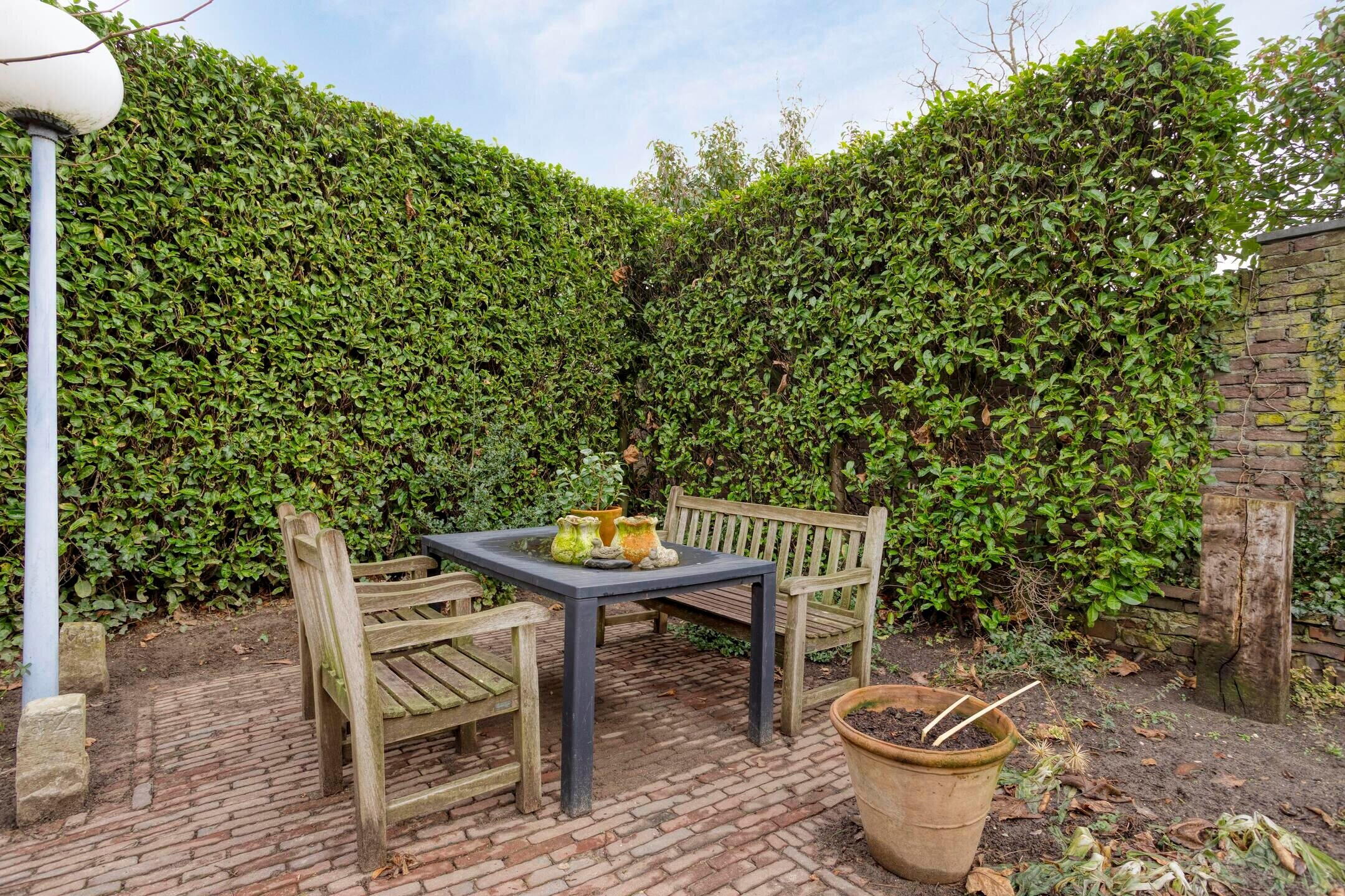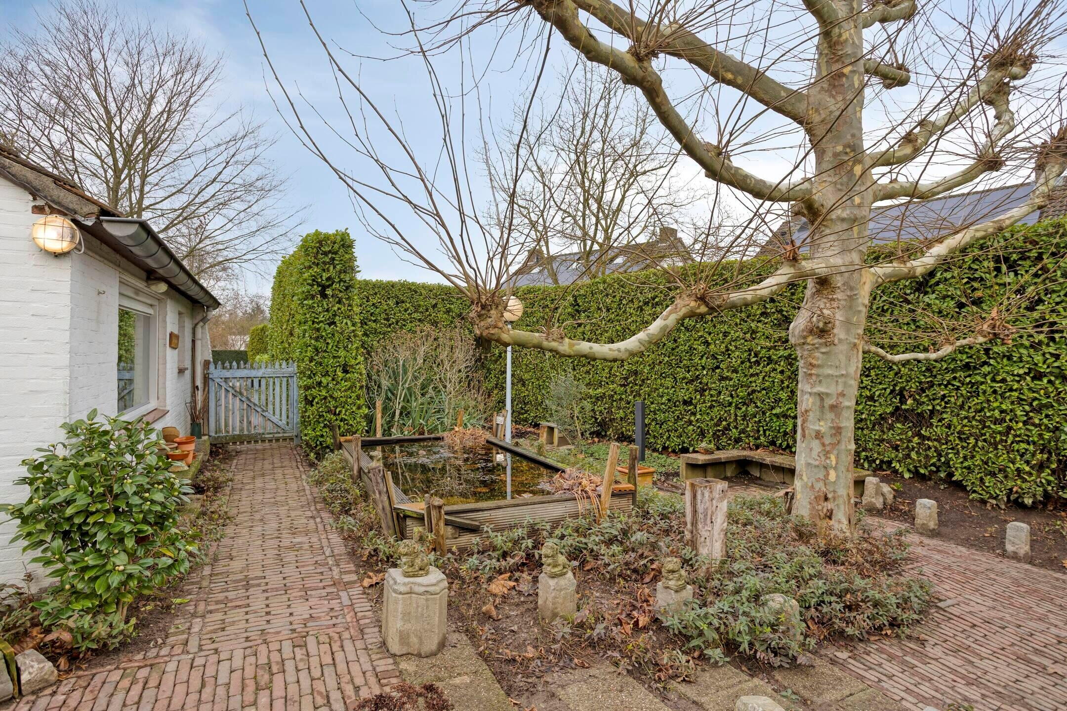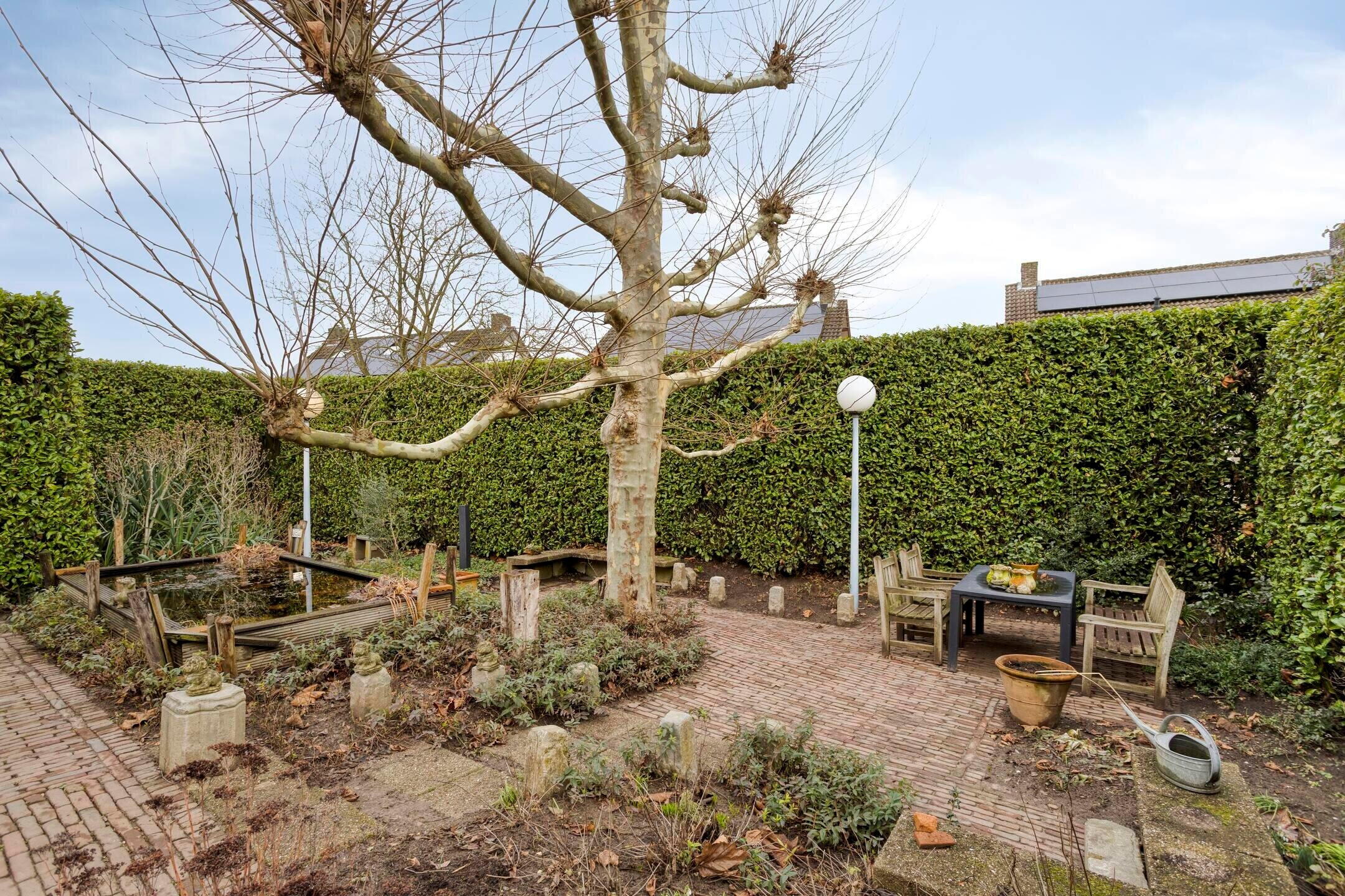 De tuin vormt een groene omlijsting rondom de woning en biedt volop privacy dankzij volwassen hagen en bomen. Er zijn meerdere terrassen aanwezig, een vijverpartij en diverse zitplekken, waardoor er altijd een fijne plek in zon of schaduw te vinden is.