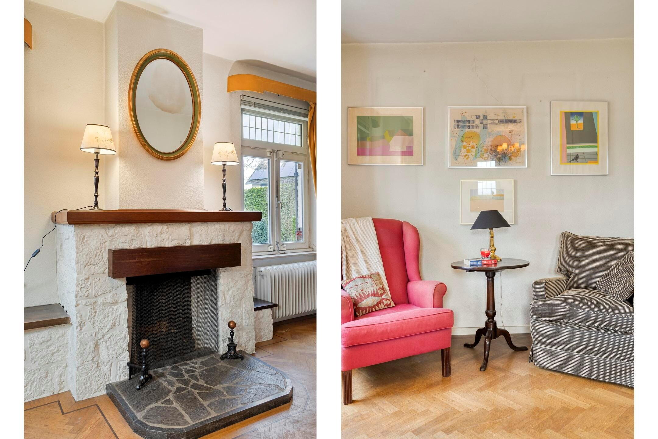 Via de entree met trapopgang en toiletruimte betreedt u de woning. De woonkamer ademt karakter dankzij de markante schouw met open haard en de grote raampartijen die zorgen voor een mooie lichtinval en zicht op het omliggende groen.
